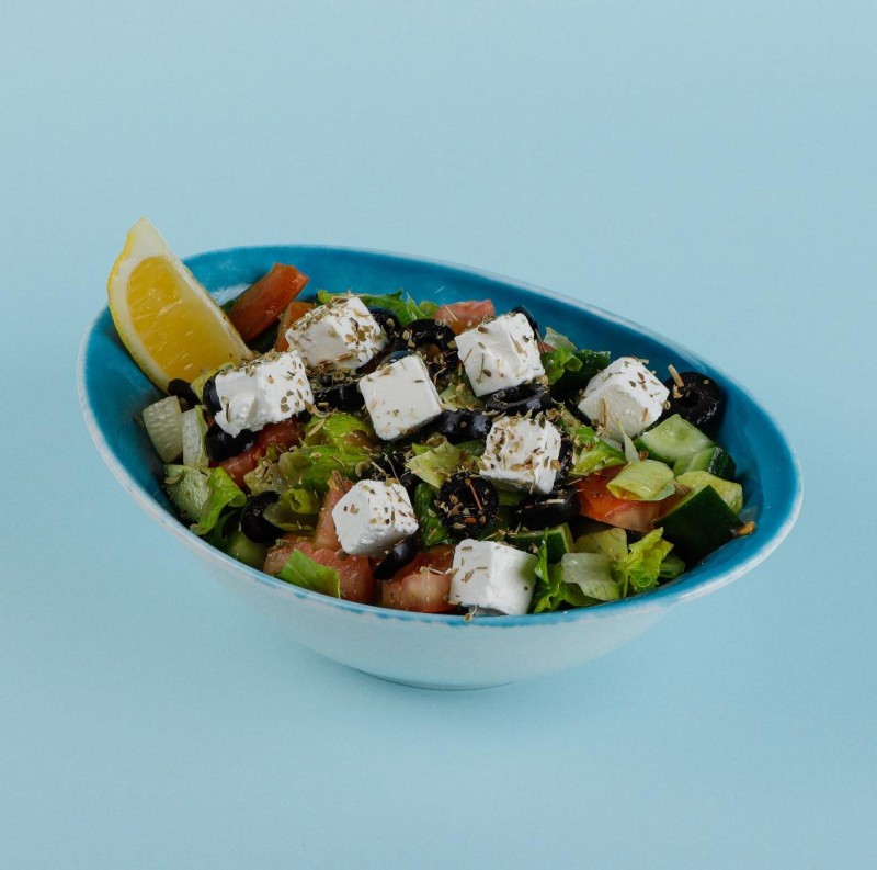 (263 سعرة حرارية)سلطة يونانية مكونة من قطع الطماطم والخيار والبصل والزيتون والجبن وزيت الزيتون.