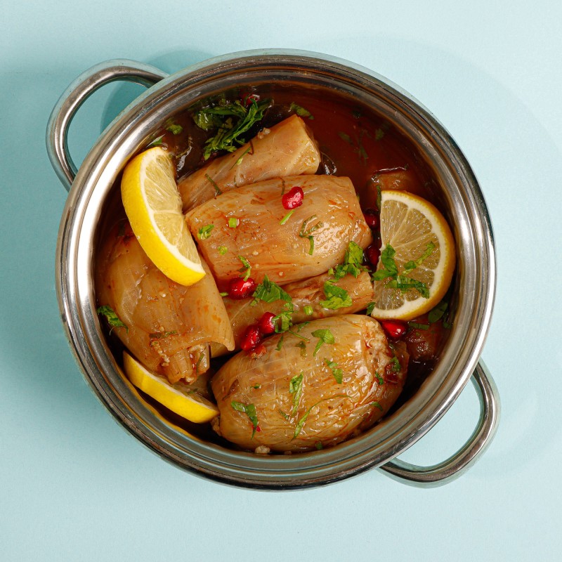 (240 سعرة حرارية)محشي ورق عنب وبصل وملفوف بالعيش واللحم والمطهي بطريقتنا الخاصة مع إضافة عصير الليمون وزيت الزيتون