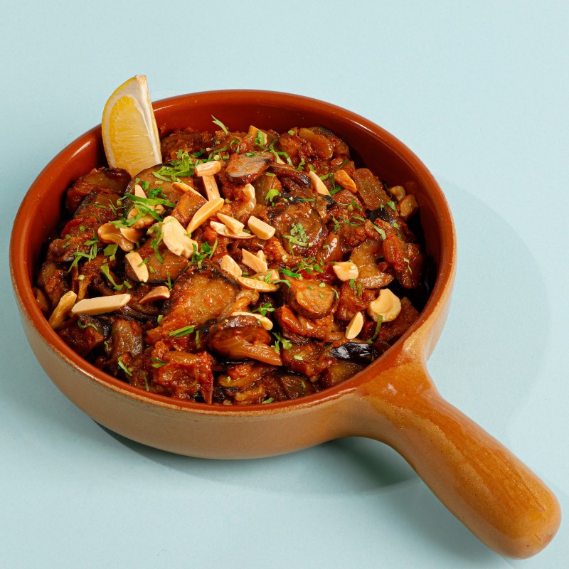 (240 سعرة حرارية)طبـــق الفقع المحموس مع الباذنجان والصوص الخاص و المكسرات