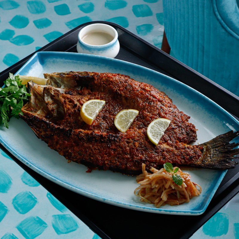 يقـــدم سمك الـــقاروص (السيباس) المشوي بالفرن مع الصوص الخاص