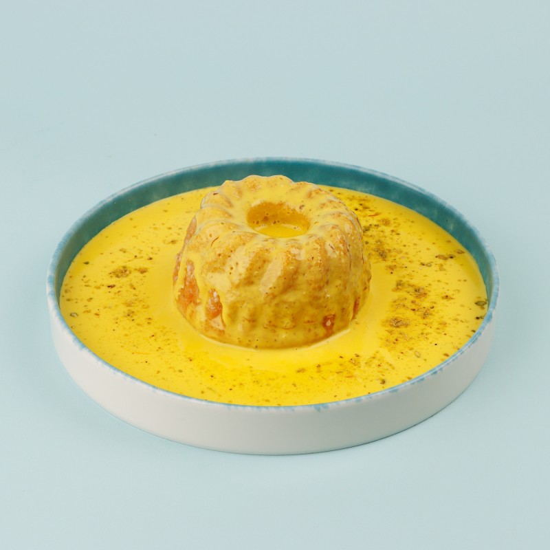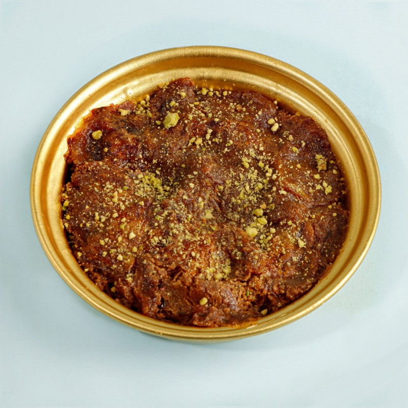يحضر قرص العقيلي بالزغفران و الهيل ويقدم مع صوص الزعفران ويزين بالفستق