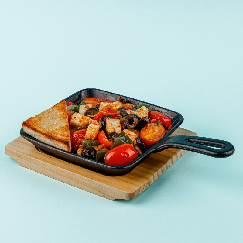 قطع من جبنة الحلوم مع زيتون وطماطم وبعض التوابل ويقدم قطعة خبز محمص
