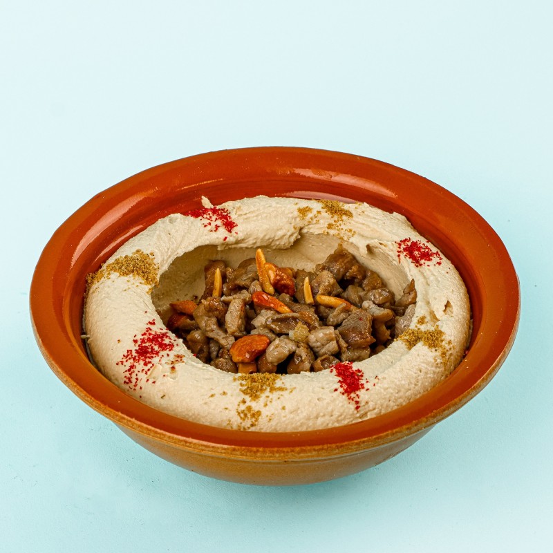 قطع اللحم المحموسه تقدم مع الحمص و المكسرات