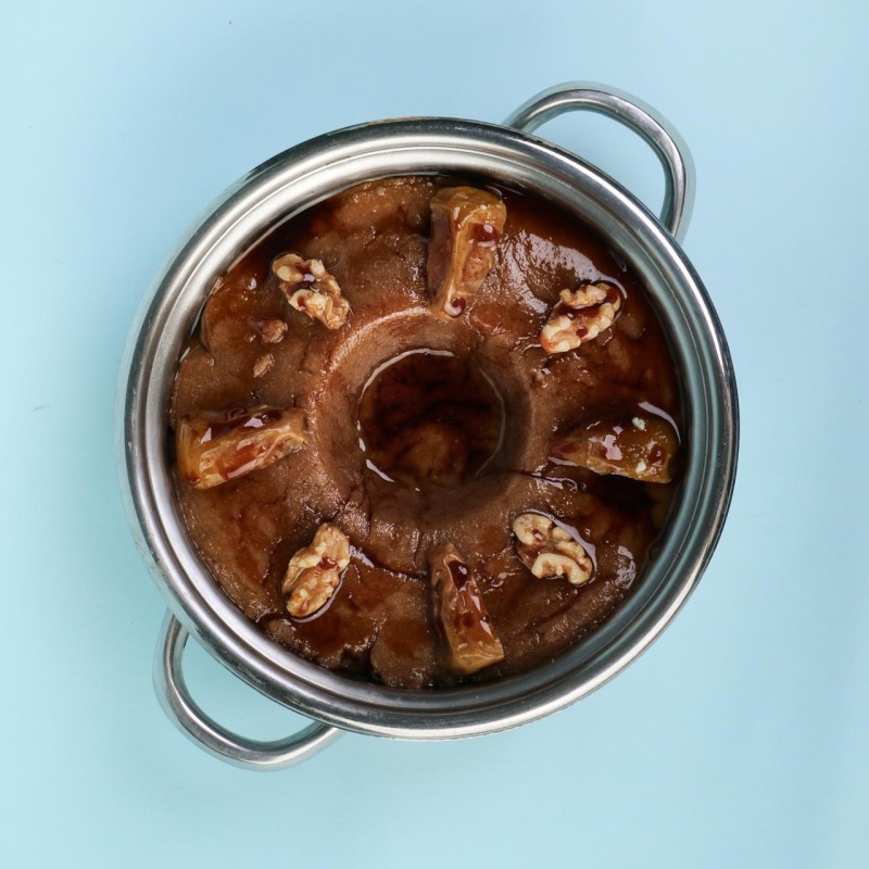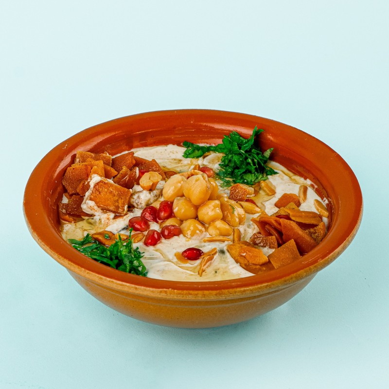 تقدم حمسة الجبدة الطازجة مع صوص وحبات الرمان